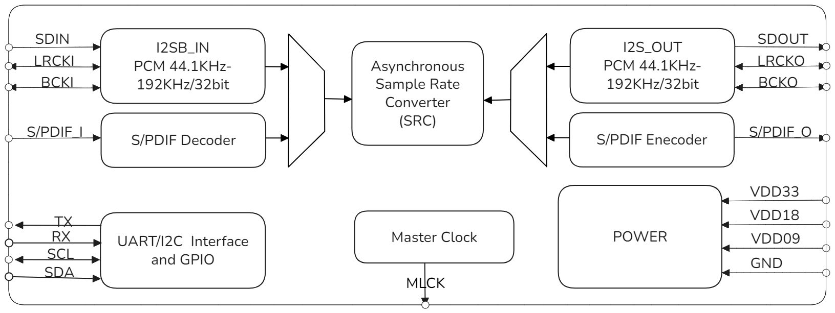 - Single SRC module architecture capable of simultaneously processing 2-channel audio sample rate conversion.