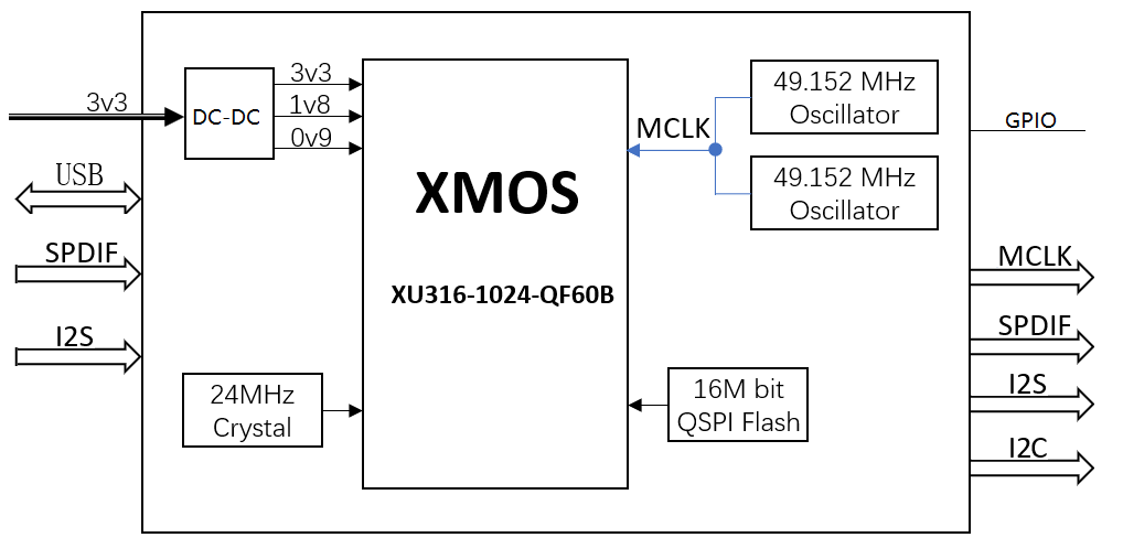 - A316-1926V1是⼀款 USB多路高清音频解码器模组。模组使⽤XMOS的XU316-1024-QF60BC24芯⽚,集成了高精度DC-DC芯片,输出1.8V,0.9V电压给XU316 。模组集成了48.152MHz和49.152MHz有源晶体,满足不同高清音频采用率要求。模组内置XU316所需的24MHz晶体以及16Mbit Flash用来存储音频固件。